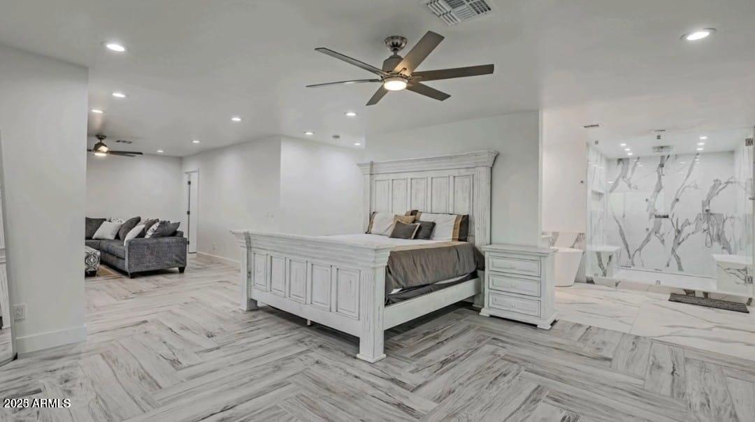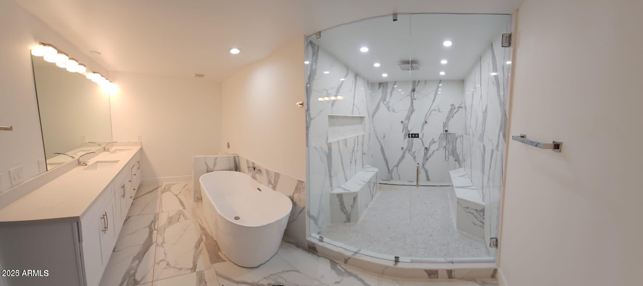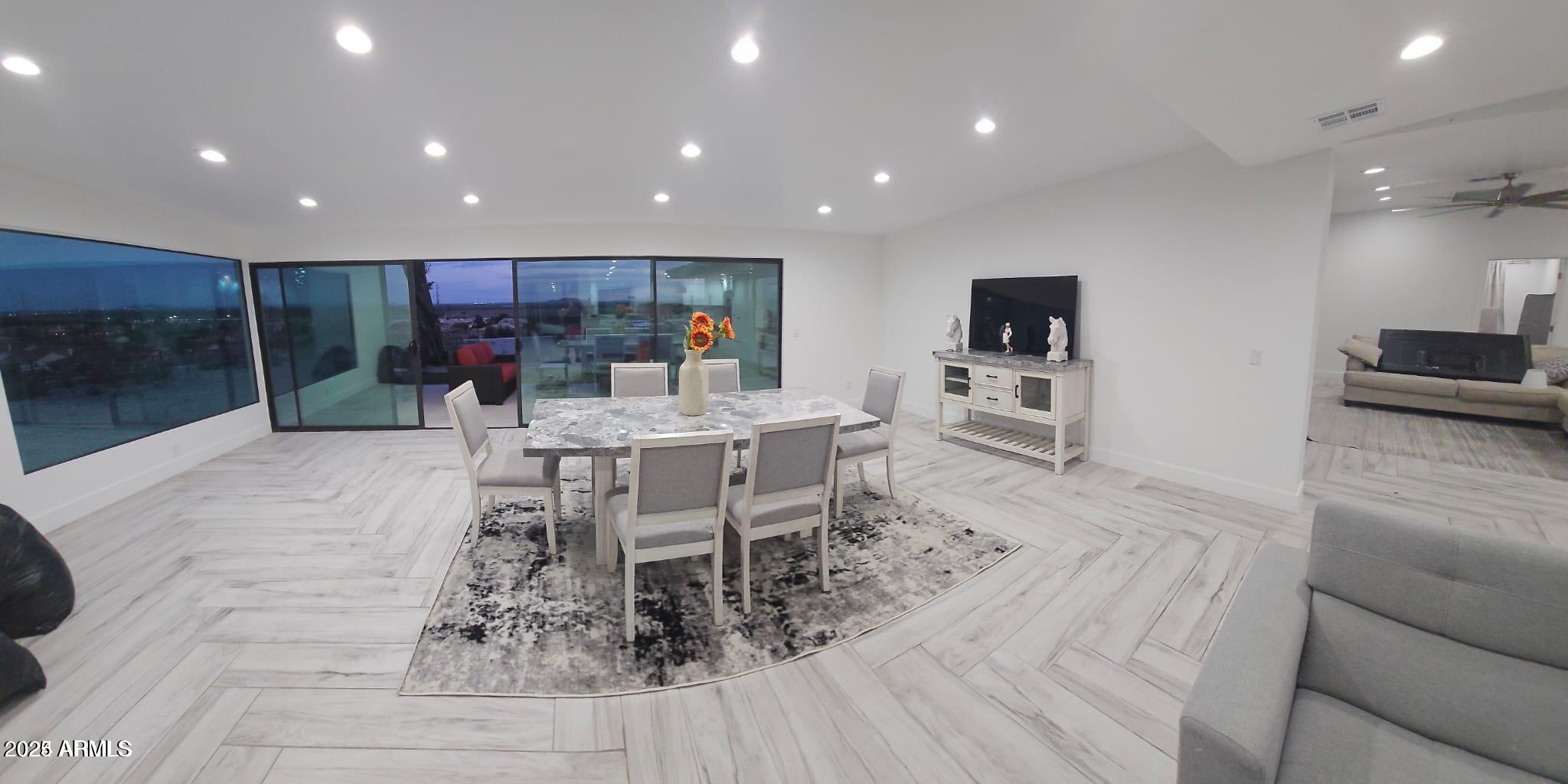 Spanning 4099 square feet, the home features 4 spacious bedrooms and 3.5 baths, enhanced by marble tile flooring throughout and an abundance of natural light. The expansive great room showcases retractable glass doors, creating a seamless indoor-outdoor living experience and framing the stunning desert landscape.